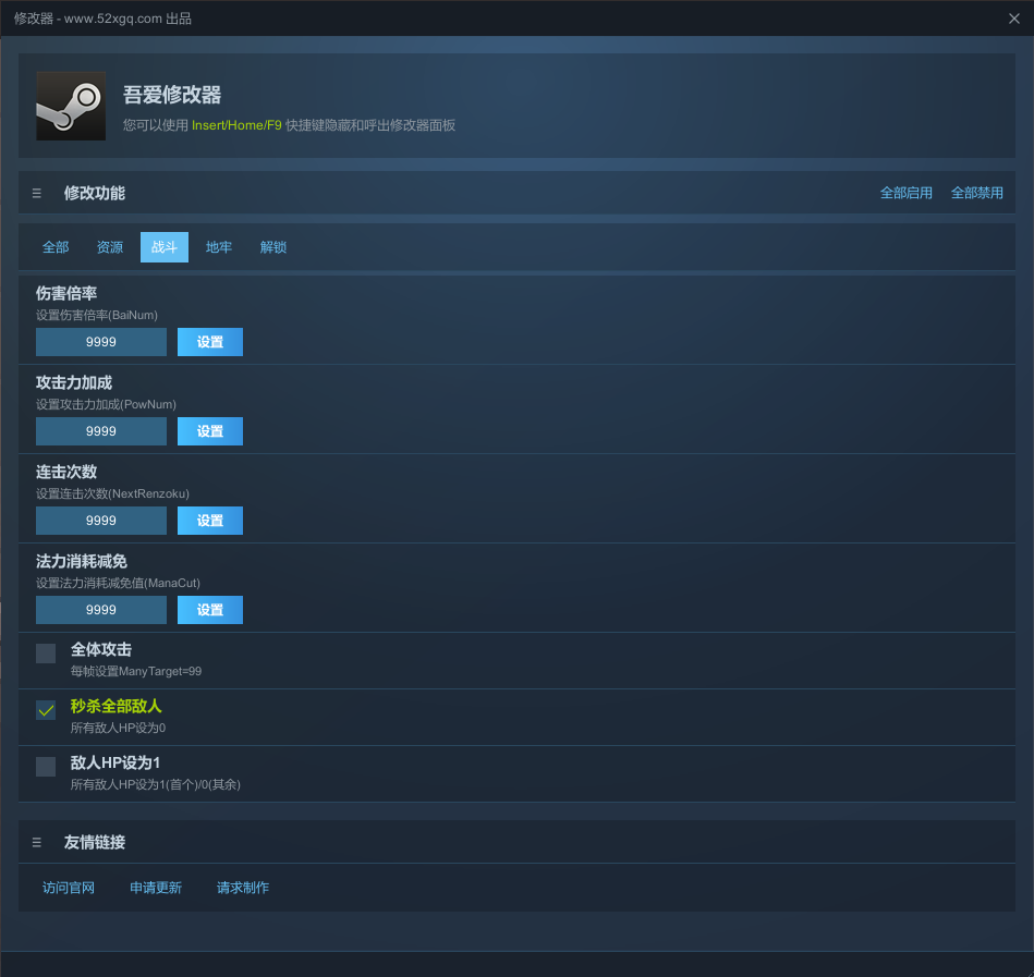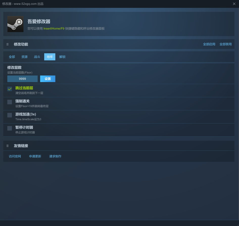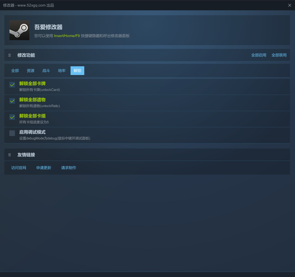 这是吾爱开发的《Lethal Dungeon》的修改器,功能包括:修改金币、修改法力、无限法力、修改手牌上限、伤害倍率、攻击力加成、连击次数、法力消耗减免、全体攻击、秒杀全部敌人、敌人HP设为1、修改层数、跳过当前层、强制通关、游戏加速、暂停计时器、解锁全部卡牌、解锁全部遗物、解锁全部卡组、启用调试模式!功能非常全面!吾爱只出精品的游戏修改器!请享受它!使用方式:先打开游戏进入主界面,再打开修改器,按Insert键显示/隐藏修改器界面。